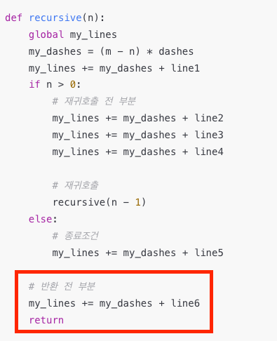 재귀호출 전 부분과 반대로 언더바 길이가 줄어들듯이 출력되는 부분을 관찰할 수 있다. 해당부분은 재귀호출 후 반환 전 부분으로 정의하고 재귀함수를 구현했다.