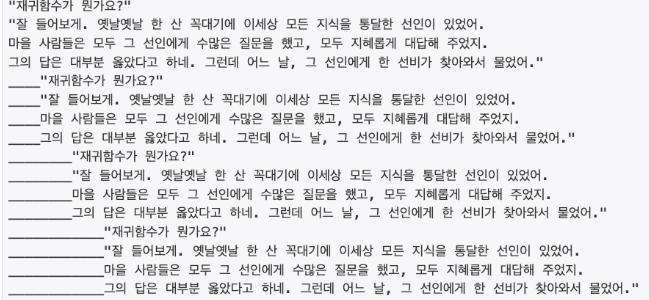 line4 = '그의 답은 대부분 옳았다고 하네. 그런데 어느 날, 그 선인에게 한 선비가 찾아와서 물었어."\n'