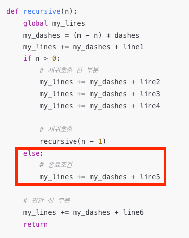 재귀호출 전 부분과 반대로 언더바 길이가 줄어들듯이 출력되는 부분을 관찰할 수 있다. 해당부분은 재귀호출 후 반환 전 부분으로 정의하고 재귀함수를 구현했다.