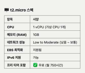 - 현재 AWS에서 임대한 인스턴스는 프리티어 버전으로 t2.micro이다